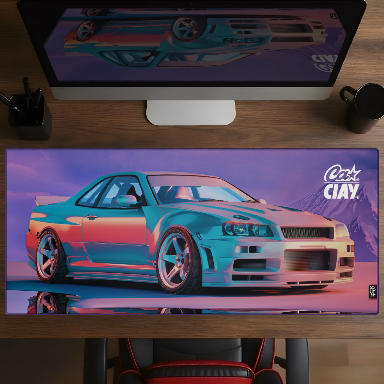 На принте изображен Nissan Skyline R34