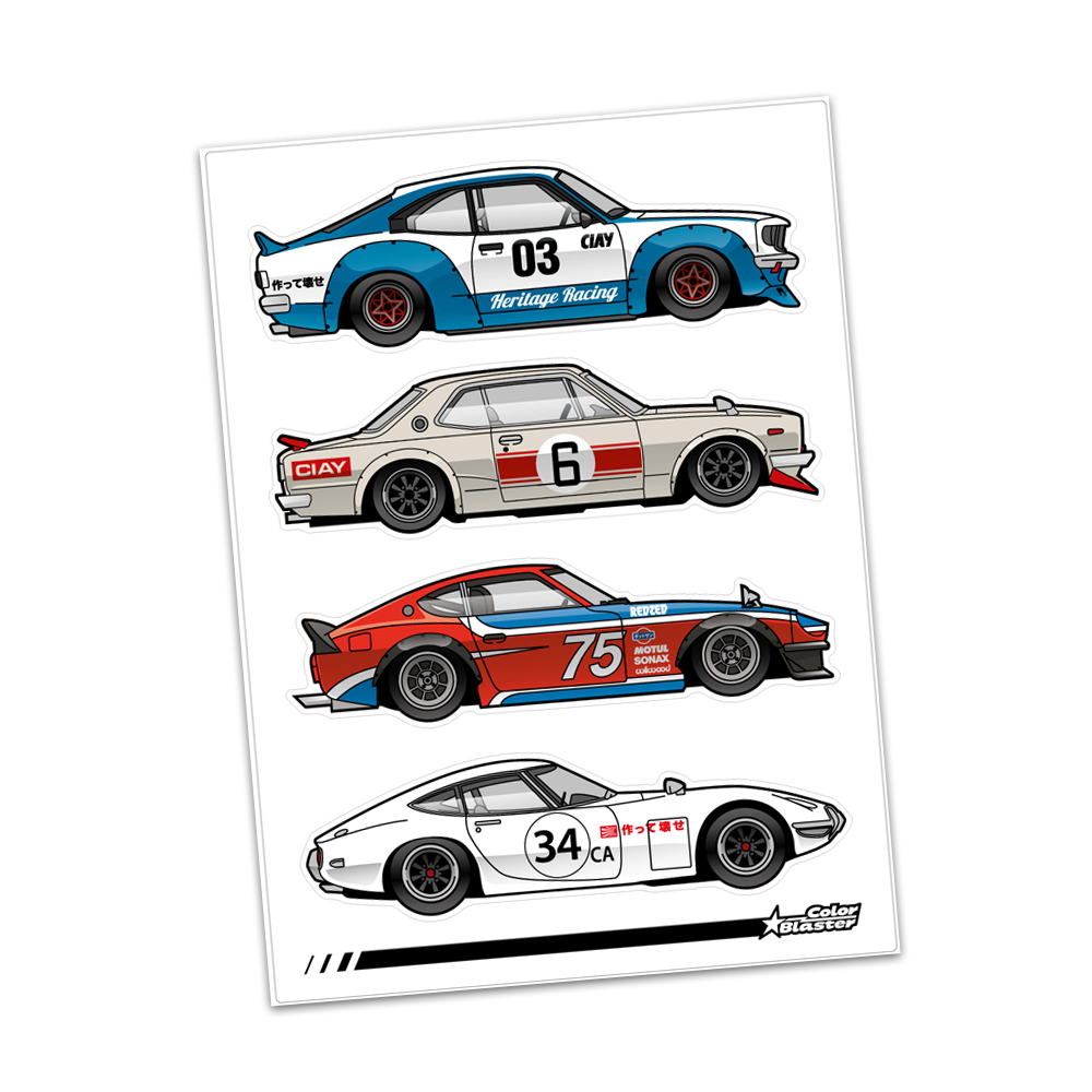Изображены Mazda rx3 , Nissan Skyline Hakosuka c10, Dastsun 280z ,Toyota 2000GT